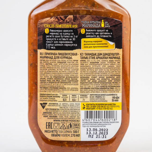 Tərkibi: su, duz, bəkməz, sarımsaq, xardal, marjoram, reyhan, kərəviz, fenugreek, ədviyyatlar, laktoza, şəkər, qatılaşdırıcılar (ksantan saqqızı E1442), turşuluq tənzimləyiciləri (sirkə turşusu, limon turşusu, süksin turşusu, E262), boyalar ( curcumin, paprika ekstraktı, şəkər rəngi), tatlar, ekstraktlar: kərəviz, sarımsaq, maya; dad və aroma gücləndiriciləri (natrium glutamat E627, E631), konservantlar (kalium sorbat, natrium benzoat).