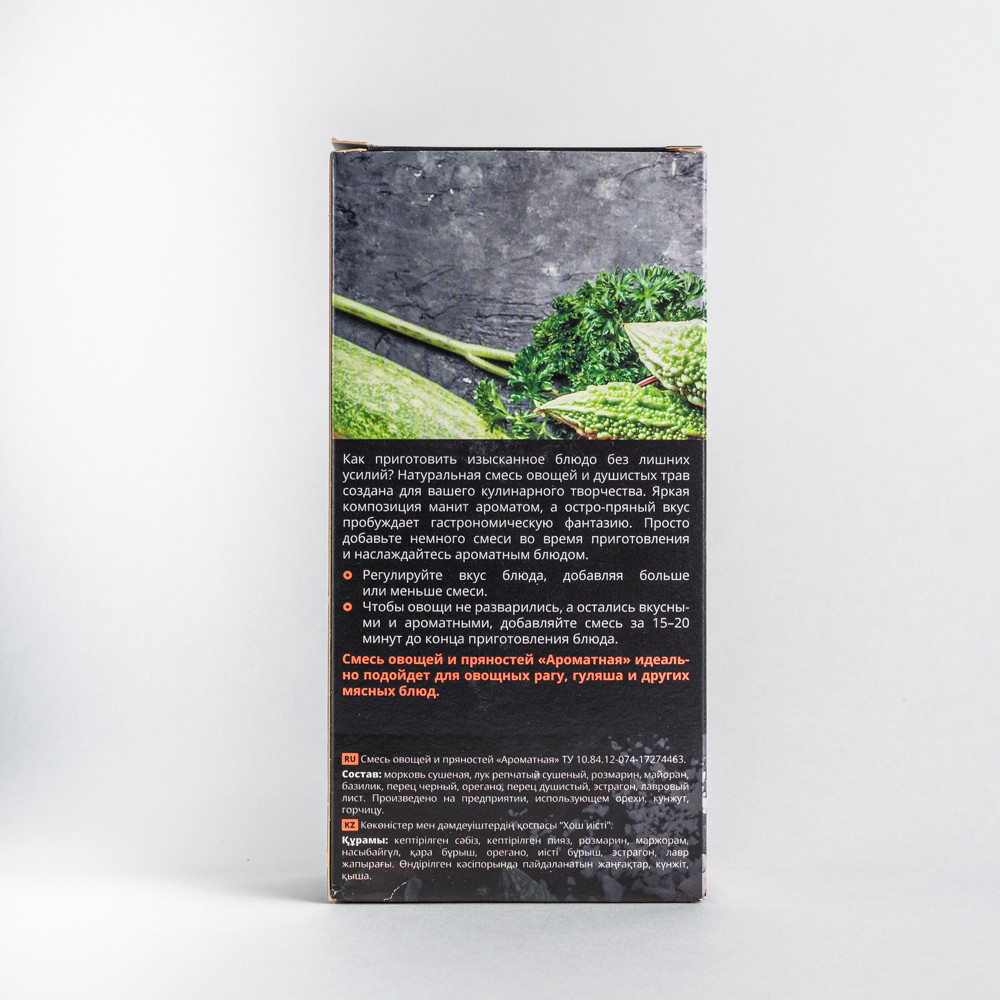 Kulinariya yaradıcılığınız üçün yaradılmış tərəvəz və ətirli otların təbii qarışığı. Aromatnaya tərəvəz və ədviyyat qarışığı tərəvəz güveçləri, gulaş və digər ət yeməkləri üçün idealdır. Pişirmə zamanı qarışıqdan bir az əlavə edin və ləzzətli bir yeməkdən həzz alın. Qarışıqdan az və ya çox əlavə edərək yeməyin dadını tənzimləyin. Tərəvəzlərin qaynamaması, lakin dadlı və ətirli qalması üçün qarışığı bişirilmənin bitməsinə 15-20 dəqiqə qalmış əlavə edin.