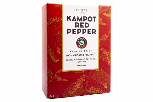 расный Кампотский перец – это полностью созревшие и собранные вручную плоды, которые промывают в воде и далее сушат под солнцем. В процессе сушки плоды приобретают красно-чёрный цвет. Красный перец менее острый чем чёрный и обладает насыщенным фруктовым ароматом.