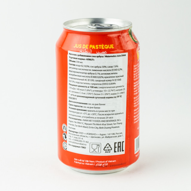 Ingredients: water (60.87%), watermelon juice (30%), sugar (8.7%), citric acid (0.28%), flavoring agent (0.1%), ascorbic acid (0.04% ), sucralose (0.01%), dyes (0.02%).