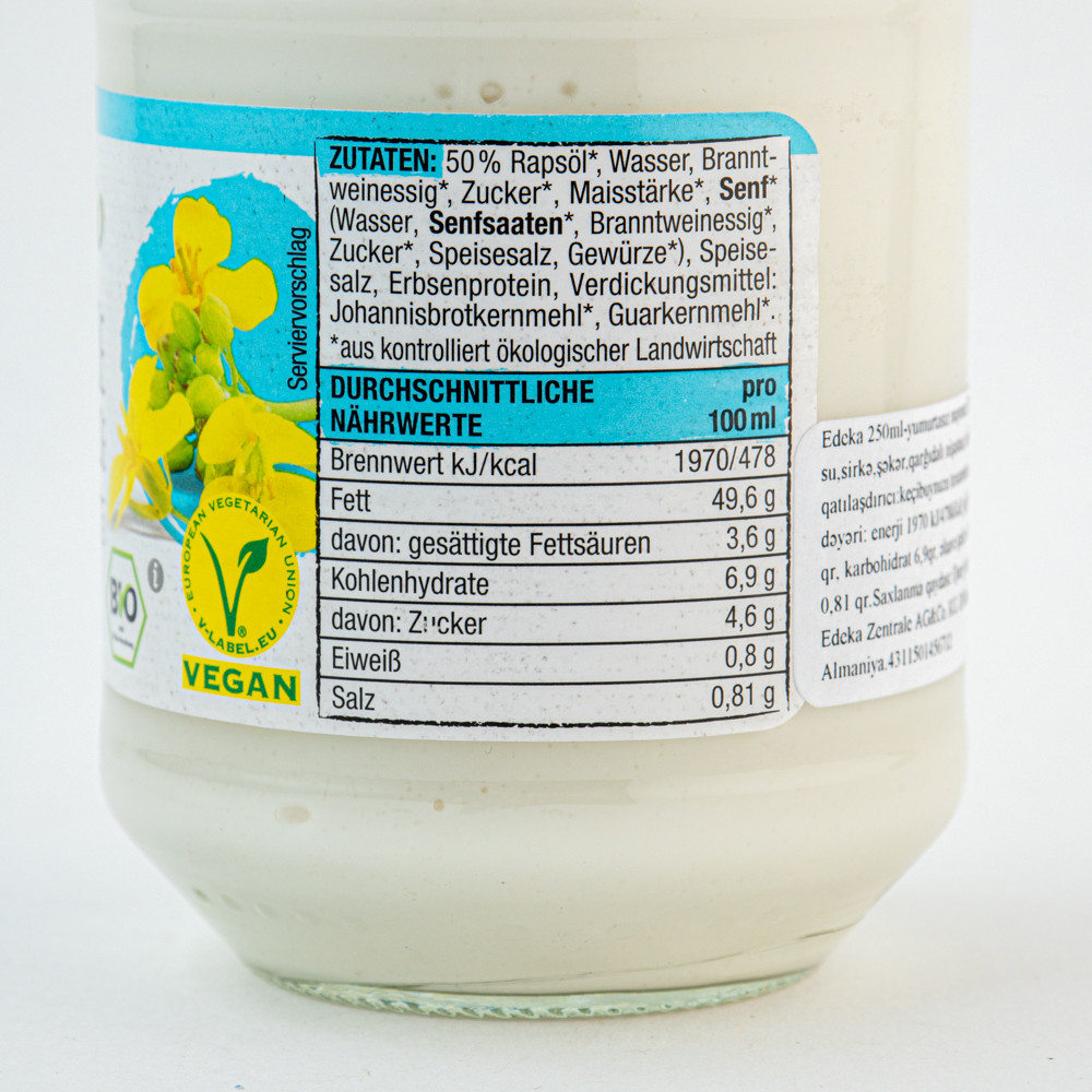 Ingredients: 50% rapeseed oil, water, vinegar, sugar, corn starch, mustard, salt, pea protein, thickener: carob seed flour.