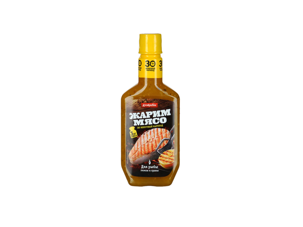 Маринад "Костровок" незаменимый продукт для приготовления барбекю или шашлыка из рыбы. Придает морской или речной рыбе необычайную нежность и сочность. Благодаря своему составу позволяет замариновать продукт всего за 30 минут. Вкус в меру острый, пикантный с тонким ароматом специй и цитрусовой свежести лимона.