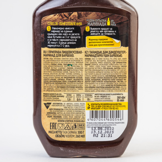 Recommended for cooking the whole range of dishes on the grill or grill. The product allows you to marinate meat in just 30 minutes, gives it a bright taste and retains juiciness. The marinade contains enough salt for cooking.