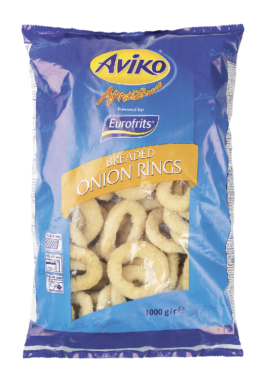 Ingredients: Onion (57%), breadcrumbs (16%) (wheat flour, salt, yeast), water, wheat flour, palm oil, sugar, sodium alginate, wheat starch, salt, stabilizer (E415, E466, E339ii), rice flour.