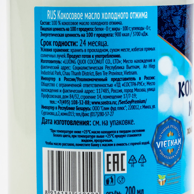 Storage conditions: Store in a cool, dry place away from direct sunlight. The product is ready to use. At temperatures below +25C, the oil is in a white solid state; at temperatures above +25C, the product becomes liquid and transparent. To melt the butter, place the jar of butter in a container of hot water.