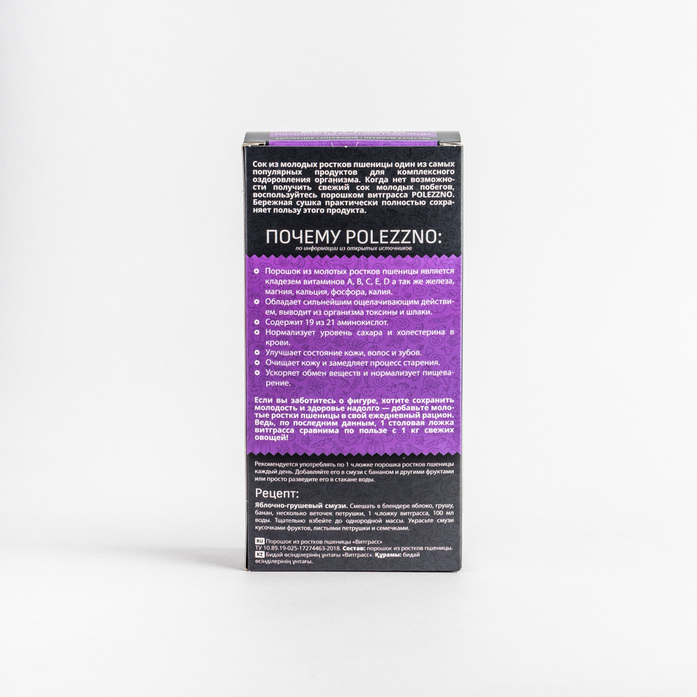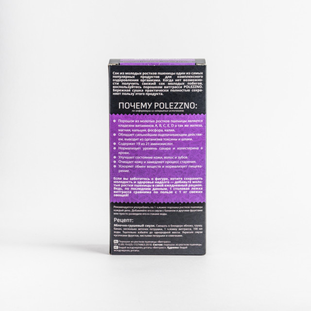 Витграсс порошок из молодых измельченных ростков пшеницы от бренда Полеззно уперфуд для похудения и очищения организма, способствует нормализации пищеварения и улучшению состояния кожи, волос и зубов. Молотые ростки пшеницы имеют приятный сладковатый вкус и насыщенный аромат свежей травы. Витграсс является незаменимым источником клетчатки, хлорофилла, белков, витаминов и минеральных веществ. Он содержит витамины А, В, С, Е, D и минералы: железа, магния, кальция, фосфора, калия, а также 19 аминокислот.