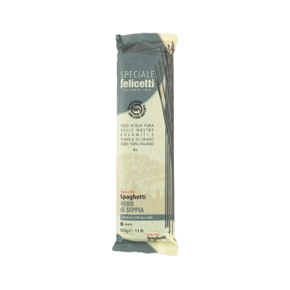 Эти спагетти имеют черный цвет из-за добавления чернил каракатицы в тесто для макарон. Прекрасно сочетается со светлыми сливочными соусами или попробуйте с оливковым маслом, чесноком и креветками.