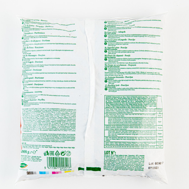 Условия хранения : Продукция хранится в сухих, чистых морозильных камерах при температуре -18°С. Выньте замороженное фруктовое пюре из упаковки и разморозьте при комнатной температуре (2,5 часа) или в холодильнике на ночь. Возможна быстрая разморозка с помощью микроволновой печи при разморозке. после разморозки хранить в холодильнике и употребить в течение 24 часов.