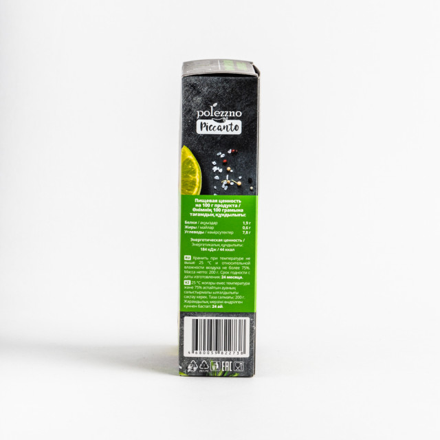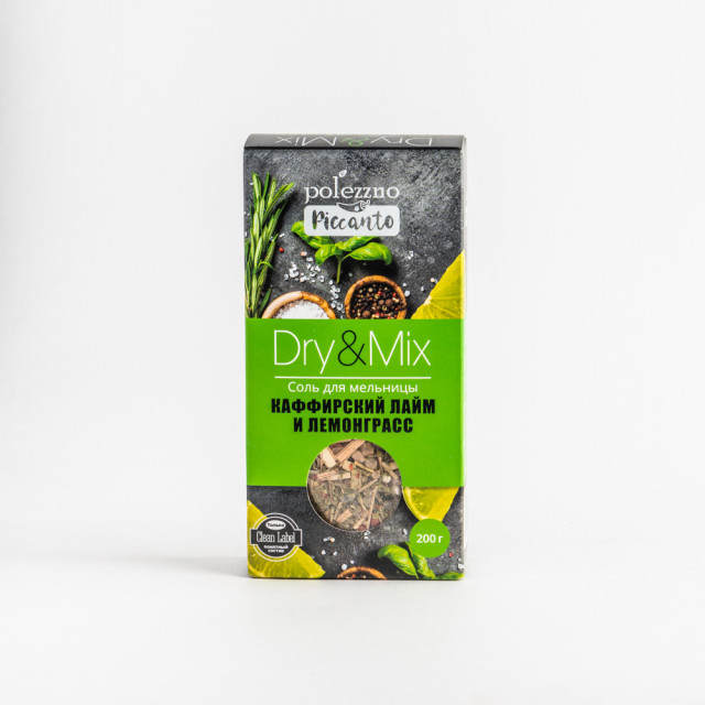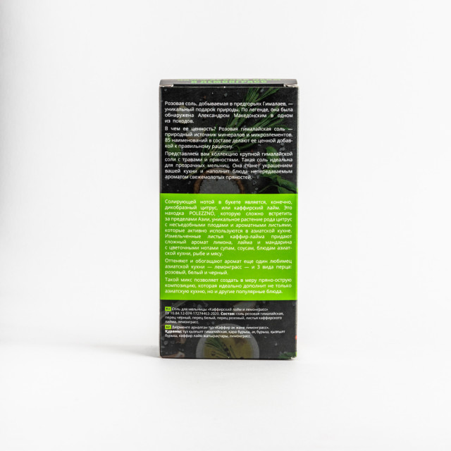 Состав: листья каффирского лайма, соль, лемонграсс, перец черный, перец розовый, перец белый.