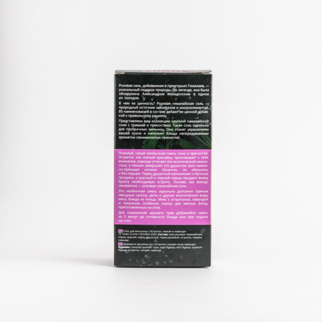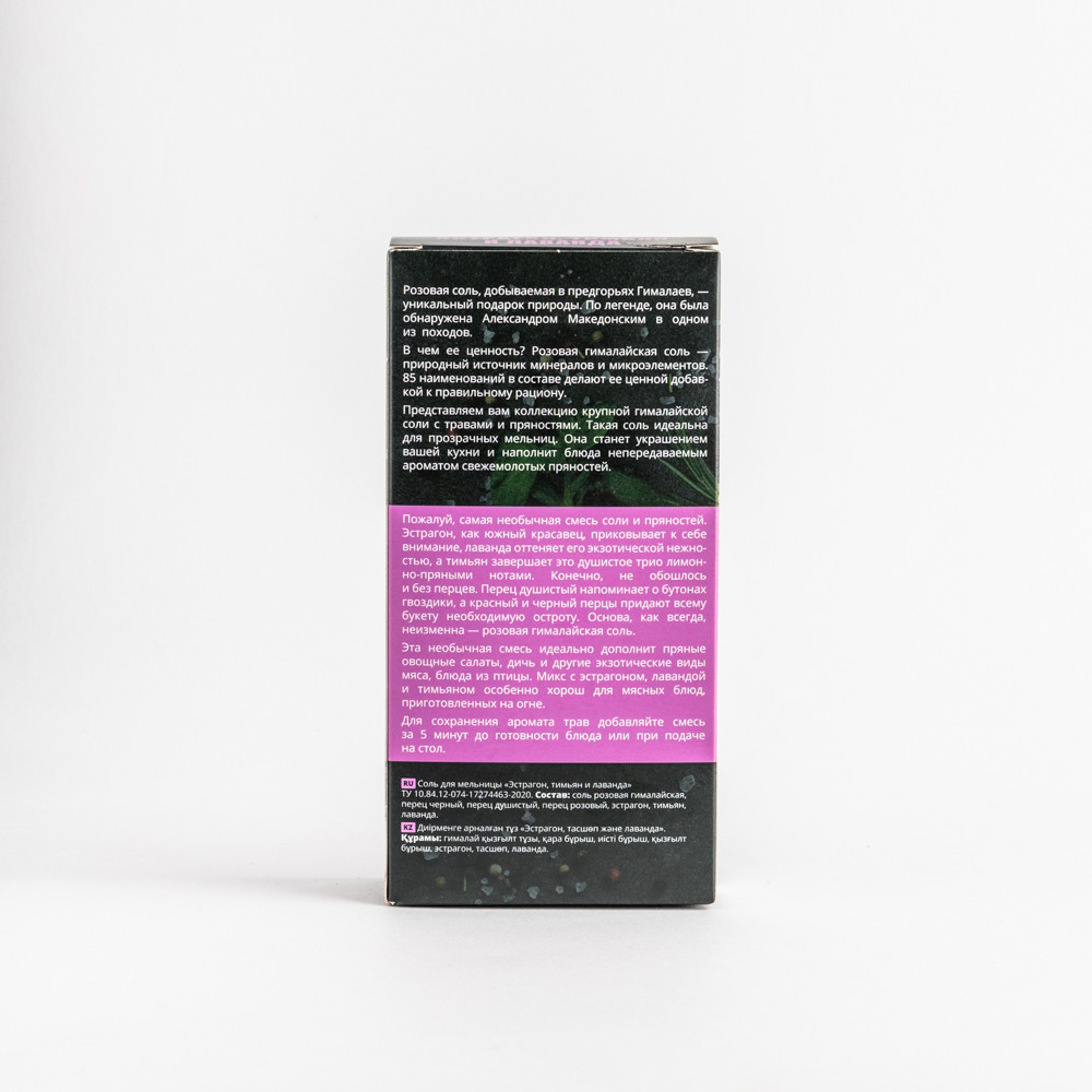Состав: соль розовая гималайская, перец черный, перец душистый, перец розовый, эстрагон, тимьян, лаванда.
