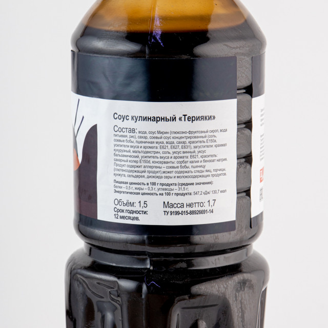 Состав: Вода, соус Мирин( глюкозно-фруктозный сироп, вода, рис), сахар. соевый соус коцентрированный (соль, соевые бобы, пшеничная мука, вода, сахар, красител Е150А, усилители вкуса и аромата Е621, Е627, Е631), запустители крахмал кукрузный,мальтодвекстрин, соль, уксус винный, уксус бальзамичесный, усилитель вкуса и аромата Е621, краситель сахарный копер Е150д, консерванты сорбат калия и бензоат натрия.